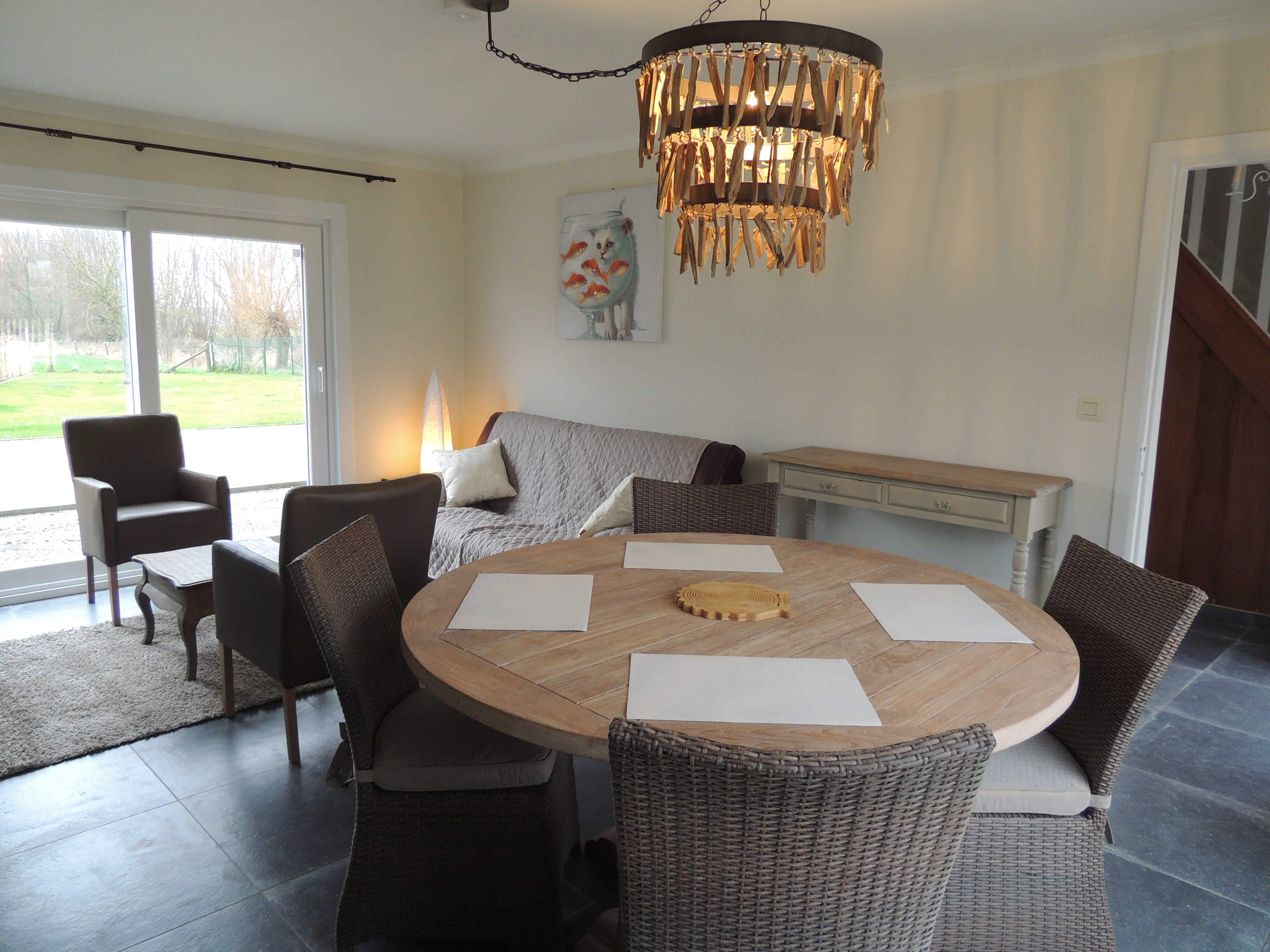- woonkamer met TV, pelletkachel.